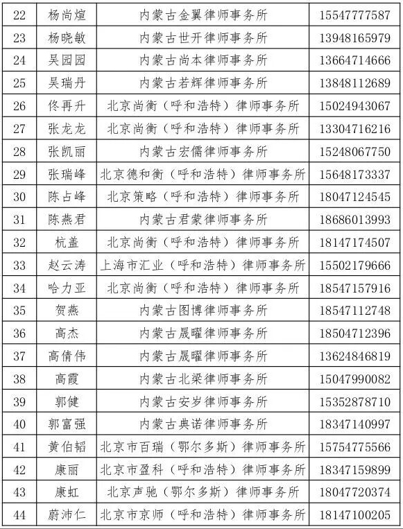 为推动我区数据合规法律服务队伍专业化、规范化建设,根据内蒙古自治区律师协会《关于组建内蒙古自治区律师行业数据合规人才库的通知》有关要求,经个人申报、律所推荐、综合评审、公示等程序,共确定44名律师入选内蒙古自治区律师行业数据合规人才库。现将人才库名单予以公告(详见附件),供各有关部门、企事业单位和个人在选聘律师时参考。